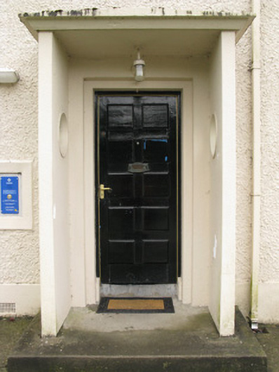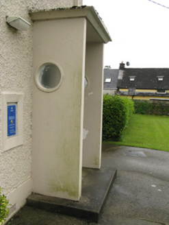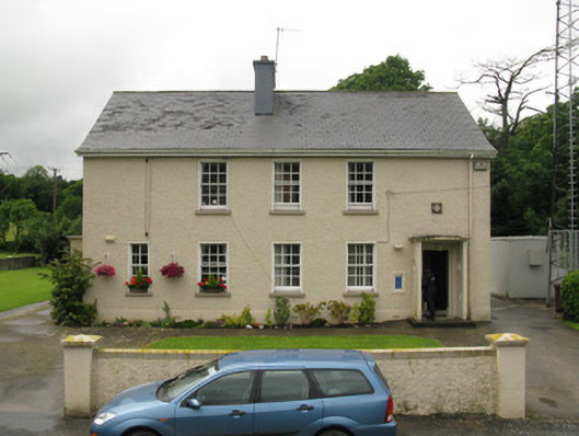 Detached five-bay two-storey pair of houses, built c. 1940, now comprising single semi-detached house and garda station having recent porches to front (east) and side (south) elevations. Pitched slate roof with rendered chimneystack, timber clad eaves and uPVC rainwater goods. Roughcast rendered walls with rendered plinth. Rendered walls to porches with render canopies. Square-headed window openings with render sills and raised rendered surrounds throughout. Six-over-six and four-over-four pane timber sliding sash windows to front elevation. Two-over-four pane timber sliding sash windows to side (north) elevation. Three-over-six and one-over-two pane timber sliding sash windows to first floor rear (west) elevation. Timber-framed tripartite window to ground floor rear elevation having central six-over-six pane timber sliding sash window flanked by two-over-two pane timber sliding sash sidelights. Occasional replacement timber casement windows to side (south) and rear elevations. Blocked window opening to north end of rear elevation. Oculus window openings to side (north and south, east and west) elevations of porches having raised rendered surrounds and fixed single-pane windows. Square-headed door openings with rendered surrounds, having tooled limestone step and timber panelled door to front elevation. Rendered step and timber battened door to side (south) elevation. Tooled limestone steps, raised rendered surrounds and glazed timber doors to rear elevation. Roughcast rendered wall to rear elevation having rendered plinth and coping. Group of flat-roofed outbuildings to west, having roughcast rendered walls. Square-headed door openings with rendered surrounds, timber battened doors and flanking glazed timber sidelights . Located within its own grounds, having roughcast rendered enclosing wall with render coping to east. Square-profile roughcast rendered piers and gate piers to splayed entrance with double-leaf wrought-iron gates.