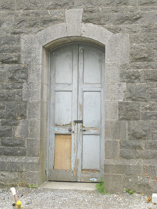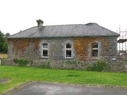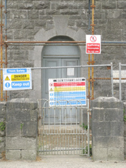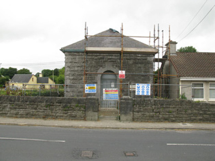 Detached single-bay double-height gable-fronted former courthouse, dated 1890, having four-bay side (north-west) elevation. Currently undergoing renovations. Hipped slate roof with tooled limestone block chimneystack, timber clad eaves and cast-iron rainwater goods. Rusticated snecked limestone walls with rusticated quoins, plinth with tooled chamfered limestone coping and rusticated limestone platband below eaves. Marble name and date plaque to front (north-east) elevation. Camber-headed window openings with tooled limestone sills throughout, having tooled limestone voussoirs, keystones, block-and-start surrounds and replacement timber casement windows. Round-headed door opening to front elevation, having tooled limestone Gibbs style surround with keystone having inscribed date. Limestone step and double-leaf timber panelled doors surmounted by timber tympanum. Camber-headed door opening to side (north-west) elevation, having tooled limestone Gibbs style surround. Limestone threshold and double-leaf timber panelled doors. Roughly dressed limestone block enclosing wall to south-west having rubble stone and render coping. Rusticated limestone block enclosing wall to north-east having square-profile piers with chamfered tooled limestone capping with wrought-iron gate.