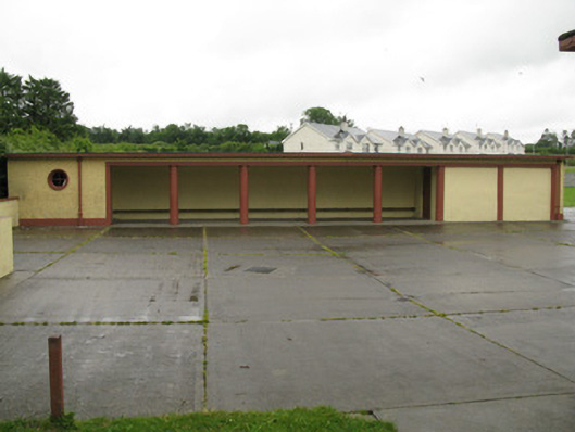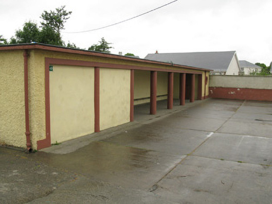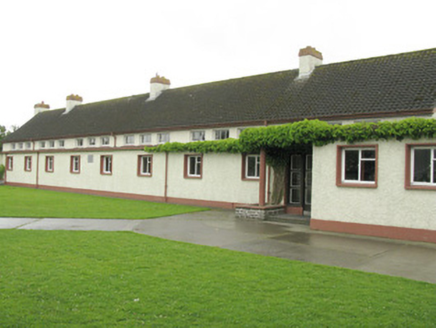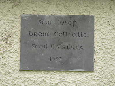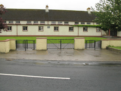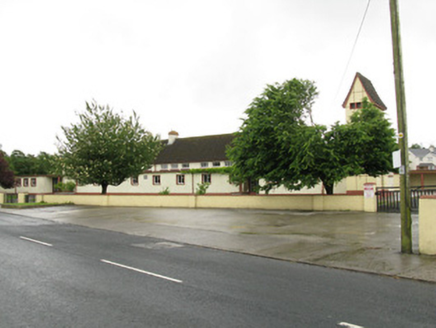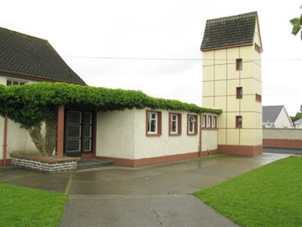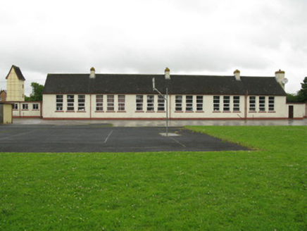 Detached six-bay double-height national school, dated 1959, having nine-bay single-storey flat-roofed corridor block to front (north) flanked by five-bay single-storey wings with canopied porches to front (north) and rear (south) elevations. Three-stage bell tower to western wing. Attached flat-roofed outbuilding to side (east) of central block. Pitched pantile roofs to central block and bell tower with rendered eaves courses and cast-iron rainwater goods. Flat bitumen roofs to front block, wings, porches and outbuilding. Roughcast rendered walls with rendered plinth and tooled limestone plaque to front elevation. Channelled rendered walls and render plinth to bell tower. Render columns to porches. Square-headed window openings with render sills and raised render surrounds windows throughout, having groups of three four-pane timber casement windows to rear (south) elevation. Groups of three tripartite timber casement windows to front elevation of main block and bipartite cast-iron framed casement windows to front elevation of corridor block and wings. Timber casement windows to side (east, west) elevations of wings and bell tower. Pointed arch louvered vent opening to side (west) elevation of central block. Square-headed door openings having glazed timber doors, having sidelights to front elevation of porches. Timber battened door to rear elevations of wings and side (west) elevation of bell tower. Timber louvered door to rear elevation of attached outbuilding. Multiple-bay single-storey outbuildings to south-west and south-east of school with lawns and tarmac basketball court to south. Roughcast rendered enclosing walls to north with render coping and square-profile piers, wrought-iron railings and single- and double-leaf wrought-iron gates.