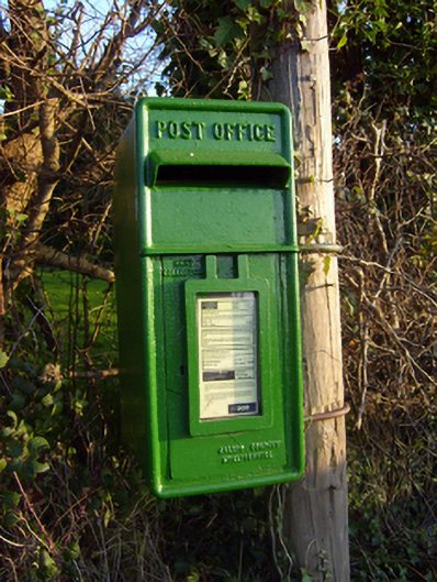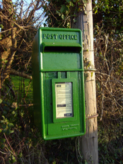 Pole-mounted cast-iron post box, installed c. 1940, with raised lettering.