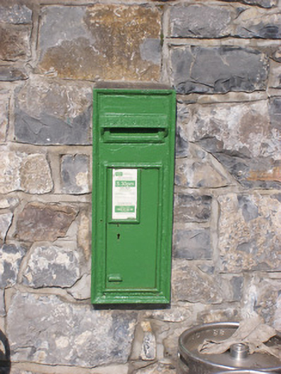 Wall-mounted cast-iron post box, erected c. 1940, with raised lettering. Manufacturer's name illegible on base. Mounted in rubble stone roadside wall.