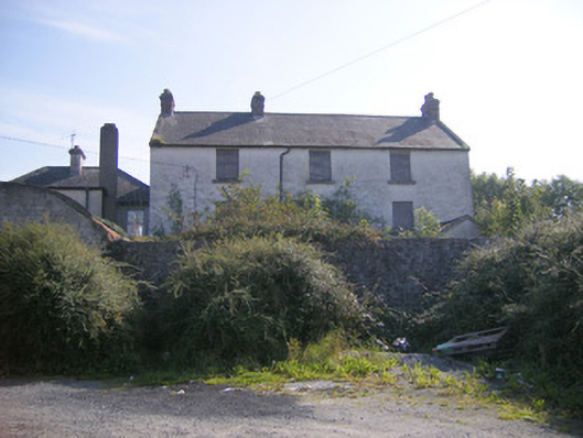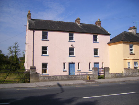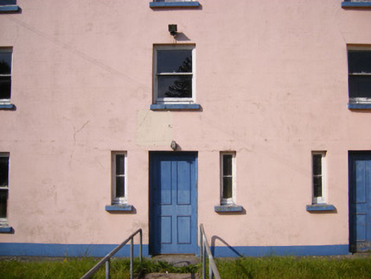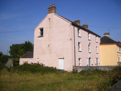 Attached three-bay three-storey former Royal Irish Constabulary barracks, built c. 1890, having single-storey extension to rear (west) elevation. Pitched slate roof with red brick chimneystacks. Lined-and-ruled rendered walls. Square-headed openings with one-over-one pane timber sliding sash windows and painted concrete sills. Square-headed openings having timber panelled doors and flanking square-headed openings with fixed windows and concrete sills. Pair of square-profile piers to south-east having single-leaf cast-iron gate and rendered boundary walls.
