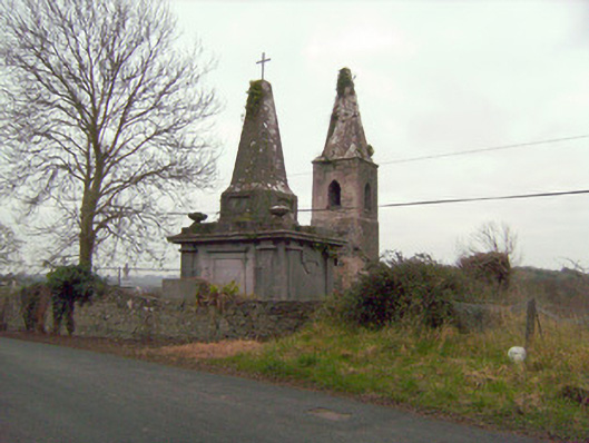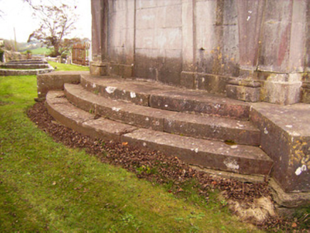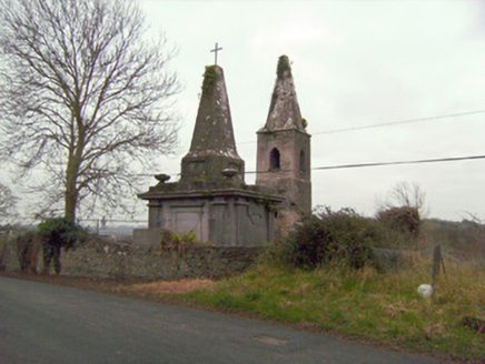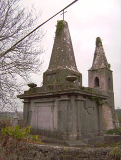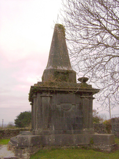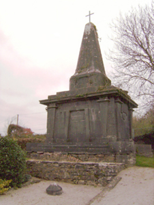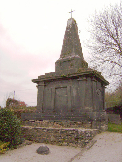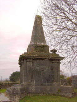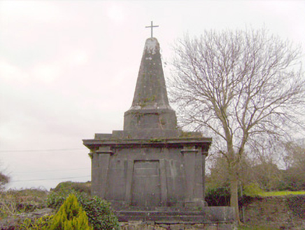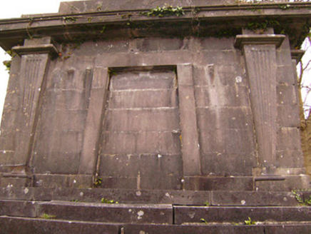 Freestanding rectangular-plan mausoleum and vault, built c. 1800. Rectangular-plan burial vault with tooled limestone monument over. Coursed rubble limestone base with clamp-kilned red brick arch to vault. Ashlar Limestone monument with limestone plinth course and tooled limestone blocks angled to corners. Square-headed Egyptian arch recess to front (south) elevation flanked by fluted Egyptian columns supporting the stepped tooled limestone capital of the monument. Square-headed recess tooled limestone lintel mould over to north elevation also flanked by fluted Egyptian columns. Approached to north and south by three curved limestone ashlar steps. Decorative limestone inverted setting sun to east and west elevations, flanked by fluted columns. Circular bowl-urns to north-west and north-east corners. Pointed limestone spire over with recent iron cross mount.