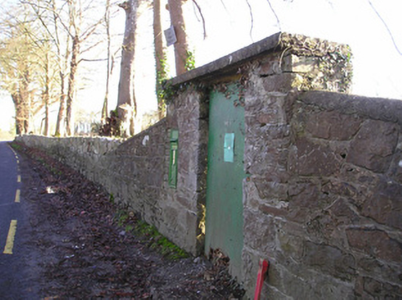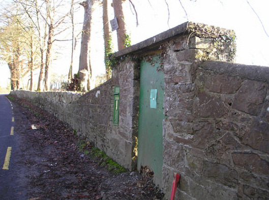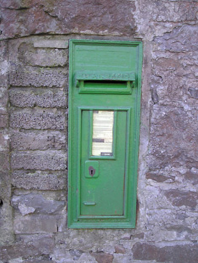 Wall-mounted cast-iron post box, c. 1905, with raised lettering. Maker's mark on base: ' W.T. Allen & Co. London'. Set into rubble stone boundary wall.