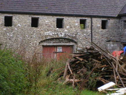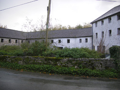 Detached multiple-bay splayed U-plan former corn and tuck mill, built c. 1790, comprising eight-bay two-storey centre block, six-bay three-storey block to west and six-bay two-storey block to east. Pitched slate roofs to east and centre blocks, hipped slate roof to west block. Rubble limestone walls to east and centre blocks. Rendered walls to end bays, centre block and west block. Square-headed window openings, some having timber lintels. Square-headed door openings, some with timber battened doors. Elliptical-headed carriage arch to east block, north-west (front) elevation having dressed limestone voussoirs and inset square-headed timber battened doors. Round-headed carriage arch to centre bay, north (front) elevation. Round-headed opening to east elevation having roughly dressed voussoirs. Pair of square-profile roughly dressed limestone pier to north having double-leaf cast-iron gates.