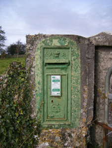 Wall-mounted cast-iron post box, erected c. 1880, with VR insignia and crown motif. Replacement cast-iron door, c. 1925, having embossed Saorstat Éireann emblem. Mounted in rubble limestone wall.
