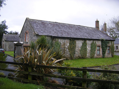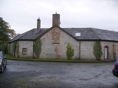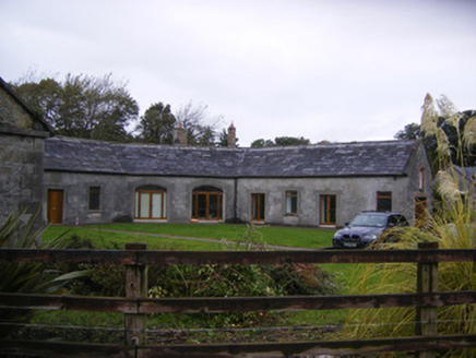 Detached multiple-bay single-storey stable block, dated 1836, on a semi-polygonal plan. Pitched slate roof with red brick chimneystacks. Tooled limestone walls, plinth course and quoins to front (east) elevation having inscribed limestone plaque to centre-bay. Rubble limestone walls to wings, gable-ends with tooled limestone quoins. Carved limestone stringcourse to south wing, east gable. Square-headed openings to front having cut limestone block-and-start surrounds with keystones, limestone sills and replacement timber casement windows. Square-headed opening to north wing, east elevation with red brick surround, limestone sill and six-over-six pane timber sliding sash window. Square-headed openings having cut limestone block-and-start surrounds with keystones and replacement doors. Elliptical-headed carriage arches having cut limestone block-and-start surrounds and replacement glazed double-leaf doors. Pair of round-profile carved limestone monolith piers to north with carved pedimented caps, plinths and double-leaf spear-headed cast-iron gates having cast-iron spear-headed railings set in limestone plinths.