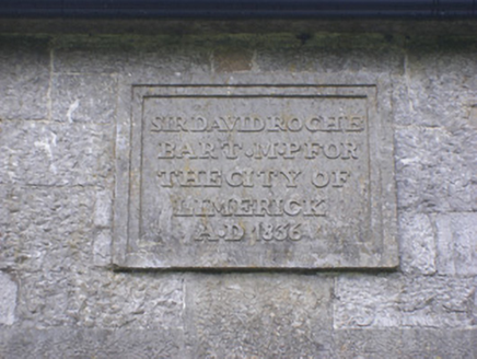 This stable block is an important structure within the historical context of the Caherass House estate. The semi-polygonal plan and details such as the flush limestone block-and-start surrounds are of particular interest. A plaque is embossed: "SIR DAVID ROCHES/BART. M.P FOR/THE CITY OF/LIMERICK/A.D 1836".
