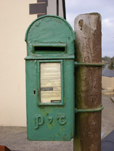 The simple form of this post box is enlivened by the P&T insignia to its base. This insignia is reminiscent of a time when both post and telegram were used widely as a means of communication. Such boxes were produced on mass following Ireland's independence from Britain in the early part of the twentieth century and replace the former VR post boxes. These round-headed post boxes are becoming increasingly rare throughtout Ireland.