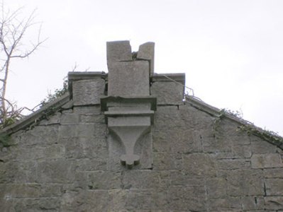 Freestanding cruciform-plan Board of First Fruits Church of Ireland church, built in 1831. Having square- and octagonal-plan two-stage entrance tower to north-west elevation and entrance porch to north-east elevation. Roof now missing, cut limestone coping with carved decorative detailing to gables. Crenellated battlements to tower having corner pinnacles and carved limestone stringcourse beneath. Snecked limestone walls having dressed quoins. Pointed arch openings under carved limestone hoodmouldings south-east elevation and to gable ends of transepts. Square-headed opening under label-moulding to entrance porch. Round-headed openings under hoodmouldings to tower. Pointed arch openings under label-mouldings having carved chamfered limestone surrounds to entrance porch and tower, those to tower now blocked. Remains of rubble limestone medieval church to north-east. Upstanding grave markers to graveyard. Rubble limestone boundary wall to site with square-profile cut limestone piers flanking wrought-iron gates.