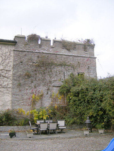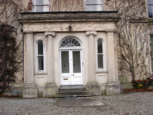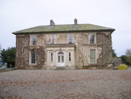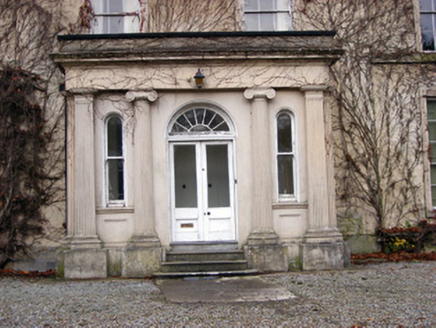Detached four-bay two-storey over basement country house, built c. 1830, with central breakfront, portico to front (west) elevation, five-bay side elevation and adjoining late medieval castle to rear (east) elevation. Hipped slate roof with overhanging eaves, rendered chimneystacks and timber eaves brackets. Roughcast rendered walls with smooth render plinth. Square-headed openings having four-over-four pane timber sliding sash windows to first floor with moulded render surrounds and continuous limestone sill course. Six-over-six pane timber sliding sash windows to ground floor with moulded surround and limestone sills. Portico comprising fluted Doric style pilasters to corners, flanking engaged fluted Ionic columns supporting entablature, central double-leaf timber glazed door having flanking round-headed sidelights and spoked fanlight above. Approached by limestone steps. Castle to rear having rubble limestone walls with cut limestone crenellations having stringcourse beneath. Single-storey modernised and extended gate lodge to front (west) of site. Cast-iron gates and railings to front of site flanked by square-profile cut limestone piers and sweep walls.