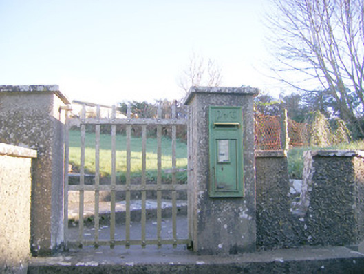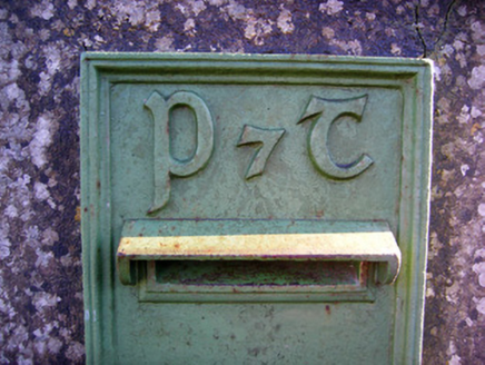 Wall-mounted cast-iron post box, erected c. 1930, with raised P&T lettering. Set into square-profile pier of neighbouring school. Manufactured by Saint John's Works Enniscorthy.