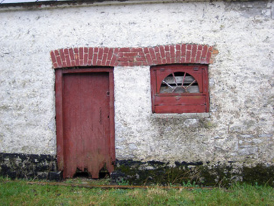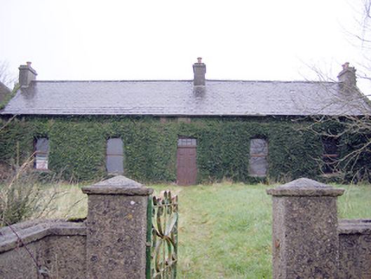 Detached five-bay single-storey with attic house, built c. 1830, having single-bay single-storey lean-to to rear (north-east) elevation with adjoining outbuilding. Outbuildings around courtyard date to the late nineteenth century. Pitched slate roof having cast-iron roof lights to rear, rendered chimneystacks and cast-iron rainwater goods. Rubble limestone walls. Cast-iron patris plates to rear. Square-headed openings with replacement timber casement windows and limestone sills. Square-headed opening having glazed overlight over replacement double-leaf timber panelled doors. Nine-bay single-storey outbuilding to north-east with pitched slate roof. Render over rubble limestone walls. Square-headed window openings. Square-headed openings having timber battened half-doors. Three-bay single-storey outbuilding to east with pitched slate roof. Roughcast render over rubble limestone walls. Square-headed opening having red brick voussoirs and timber casement window. Square-headed opening with timber battened door. Segmental-headed carriage arch having red brick voussoirs. Three-bay single-storey outbuilding to west having pitched slate roof. Roughcast rendered walls. Square-headed opening with inset spoked window and square-headed opening having timber battened door with shared red brick voussoirs. Segmental-headed carriage arch with red brick voussoirs. Pair of square-profile roughcast rendered piers having single-leaf cast-iron gate and roughcast rendered boundary walls.