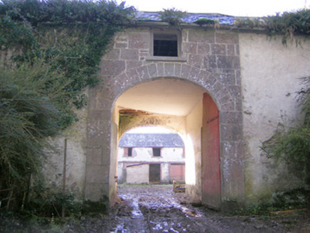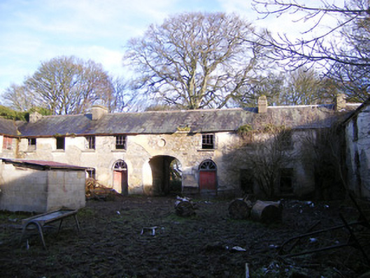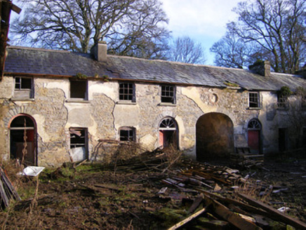 Detached multiple-bay two-storey range of outbuildings, built c. 1800, set around a courtyard. North range comprising pitched slate roof and rendered chimneystacks. Render over rubble limestone walls with blind oculus having brick surround to south elevation. Square-headed openings to first floor, some with remains of six-over-three pane timber sliding sash windows and limestone sills. Square-headed window openings to ground floor having limestone sills. Round-headed openings with dressed limestone voussoirs and spoked fanlights over timber battened doors. Elliptical-headed carriage arch to north range, north elevation having dressed limestone surround and double-leaf timber battened doors. East range comprising pitched slate roof. Render over rubble limestone walls. Diocletian style windows to first floor with timber fittings and limestone sills. Round-headed openings with spoked fanlights over timber battened doors. Elliptical-headed carriage arches having dressed limestone voussoirs. West range comprising remains of pitched slate roof. Render over rubble limestone walls. Square-headed window openings to first floor with limestone sills. Square-headed window openings to ground floor having dressed limestone voussoirs and limestone sills. Round-headed openings with spoked fanlights over timber battened doors. Timber stalls to interior having carved timber columns. South range comprising pitched slate roof. Render over rubble limestone walls. Square-headed window openings to first floor with timber fittings and limestone sills. Square-headed openings having timber battened double-leaf doors. Round-headed door opening with spoked fanlight over timber battened door. Rubble limestone walled garden to north.