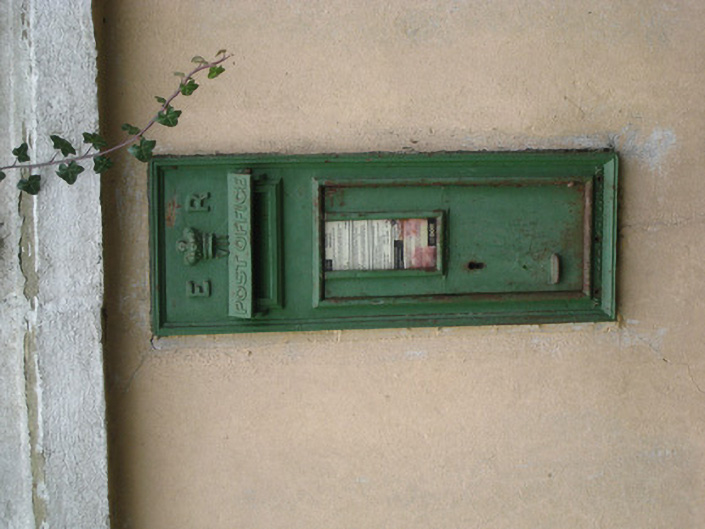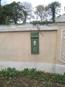 Wall-mounted cast-iron post box, c. 1905, with the royal insignia of Edward VII. Mounted in rendered wall at entrance to the Summer Ville house.