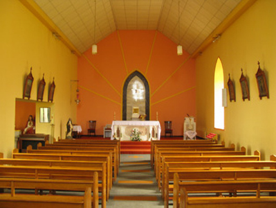 Freestanding three-bay double-height gable-fronted Roman Catholic church, built c. 1865, having porch to front (west). Having gable-fronted projecting bay, three-bay single-storey addition and two-stage water tower to side (north). Pitched artificial slate roofs with uPVC clad eaves and uPVC rainwater goods. Bitumen clad flat roof to addition. Rendered flat roof to water tower. Roughcast rendered walls with rendered plinth and platbands. Pointed arch window openings with render sills throughout, having render surround and timber-framed lead-lined stained glass window to front elevation of nave. Timber casement windows with intersecting timber tracery to side (north, south) elevations of nave. Round-headed window opening with render sill to side (north) elevation of projecting bay, having render surround and timber casement window. Square-headed window openings with render sills and surrounds to addition, having timber casement windows. Tripartite timber casement window to side (north) elevation of addition. Square-headed door openings with raised render reveals throughout, having double-leaf glazed timber doors to front elevation of porch surmounted by single-pane overlight with etched cross. Glazed timber door flanked by glazed timber sidelights to side (west) elevation of addition. Double-leaf louvered timber doors to side (east) elevation of addition. Timber battened door to side (south) elevation of water tower. Composite tiled ceiling to interior with render surrounds to windows. Pointed arch recess to chancel with rendered surround, accommodating white marble panel within black polychrome marble surrounds framing central pedestal surmounted by shrine with brass plaque. Carved marble altar with polychrome panels and engaged columns. Recent cast-iron framed belfry to north-west of site within rubble stone enclosing wall with dressed limestone coping. Splayed entrance with square-profile tooled limestone piers, rendered enclosing wall with tooled limestone coping, single and double-leaf wrought-iron gates.