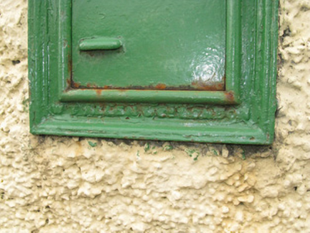Wall-mounted cast-iron letter box, installed c. 1890, bearing raised lettering to hood over opening and manufacture's name to base of front (south-west) elevation. Mounted in rough-cast render pier with render plinth and capping forming part of entrance to presbytery associated with Saint Ita's Roman Catholic Church.
