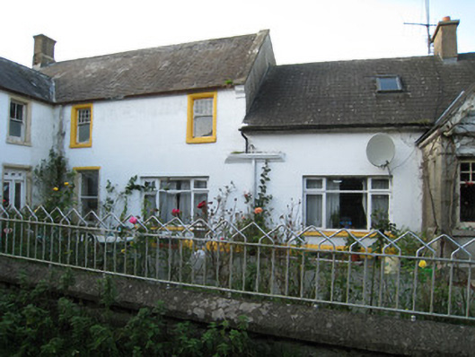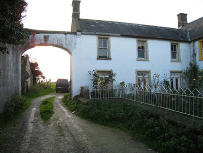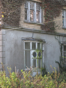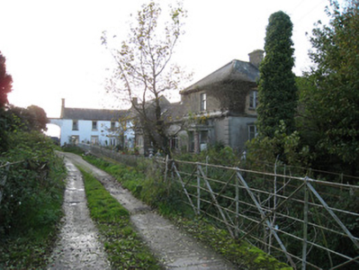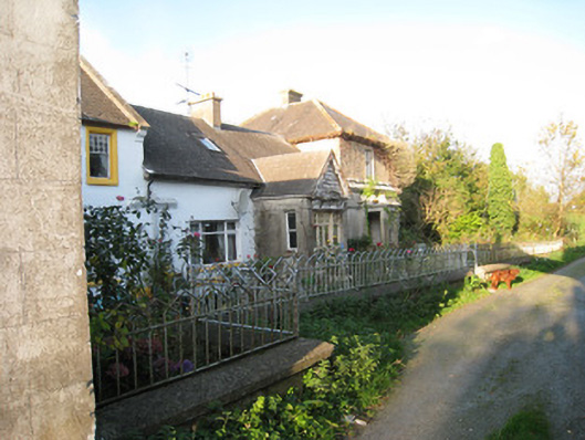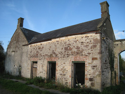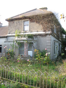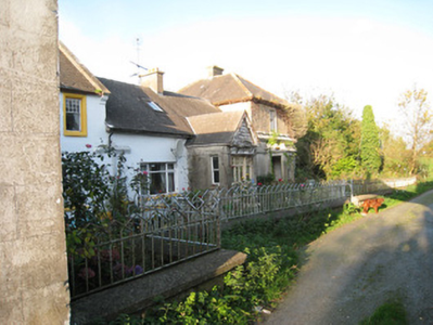 Attached five-bay two-storey L-shaped house, built c. 1800, with single-storey gable fronted extension linking it to T-shaped three-bay house, c. 1860, to east. Pitched slate roof to L-shaped house with cast-iron rainwater goods and render bracket to gable. Square-headed openings having twelve-over-one timber sliding sash windows and render surrounds to first floor. Square-headed openings with two-over-two timber sliding timber sash windows to first-floor. Timber casement windows to ground-floor. Smooth rendered brick segmental-arch to south elevation. Random rubble sandstone wall to west elevation wit square-headed door openings with brick surrounds. Hipped slate roof with terracotta ridged tiles smooth render chimney stack with cast-iron rainwater goods to later house. Roughcast render walls to second storey, smooth render walls to first storey with moulded render banding to top and render quoins. Square-headed openings with three nine-over one timber sliding sash windows to first floor. Square headed openings to ground-floor having curved bay with timber panelling to ground two circular leaded glass windows with eight pane surround to west elevation. Square-headed opening to south with nine-over-one timber-sliding-sash windows, canted bay-window with render cornice and three one-over-one timber sliding sash windows. Single-storey extension to west having pitched artificial slate roof with smooth rendered chimney stacks and plastic rainwater goods. Square-headed openings with modern timber windows. Gable-fronted entry porch having shingle apex and decorative bargeboard. Square-headed opening having glass and timber panelled door flanked by sidelights. Three-bay single-storey pitched outbuilding to south-west having segmental-arched openings. Concrete road bridge to entry with V-cutwater and wrought-iron railings.