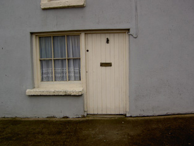 Terraced three-bay two-storey house, built c.1800, on curved and ascending site. Steeply pitched artificial slate roof, westernmost bay slightly lower, and having cement-rendered chimneystack and cast-iron rainwater goods. Painted smooth rendered walls. Square-headed irregularly aligned window openings with painted moulded render surrounds, painted stone sills and timber casement two-over-two pane windows. Square-headed door opening to ground floor, having timber battened door and integral fixed timber three-over-three pane former display window. Square-headed double-leaf timber battened door to carriage arch at north end.