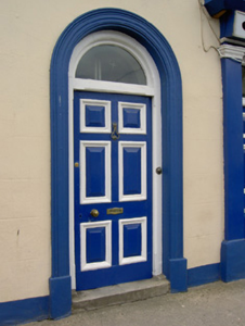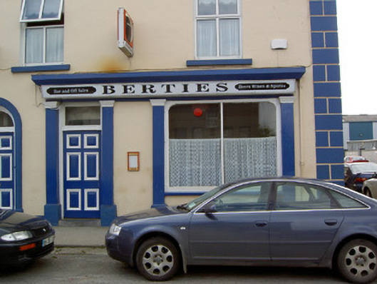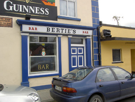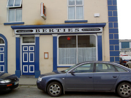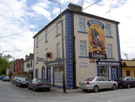 Corner-sited end-of-terrace three-bay three-storey house and public house, built c.1880, having multiple-bay single-storey flat-roofed extension to rear. Hipped slate roof with clay ridge crestings and capping, some cast-iron rainwater goods and rendered chimneystacks. Painted rendered walls with render quoins. Pub-fronts to front and northwest elevations comprising fixed timber display window to front and metal to gable, with replacement cornices, fascias and pilasters, with render plinths. Painted advertisement to first and second floor of northwest gable. Square-headed window openings with painted stone sills, having replacement uPVC windows. Round-headed door opening to front façade with moulded render surround, timber panelled door and fanlight. Square-headed door openings to pub-fronts having timber panelled doors and overlights.