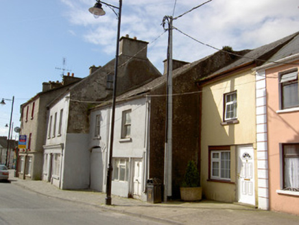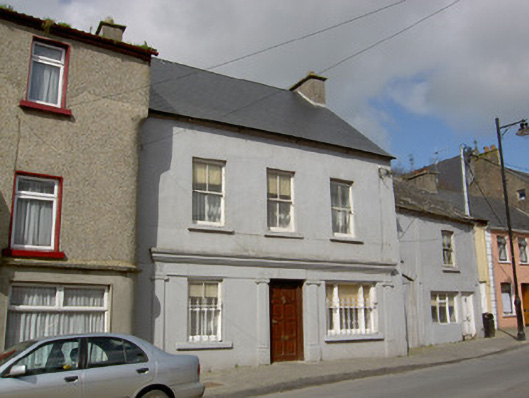 End-of-terrace three-bay two-storey with attic house, built c.1890, with former shopfront to ground floor, and recessed lower two-storey block to north having integral carriage arch. Pitched artificial slate roof to house, pitched slate to north block, with rendered chimneystacks and cast-iron rainwater goods. Painted smooth render to walls. Panelled render pilasters to north block. Two-over-two pane timber sliding sash windows, one tripartite to former shop window, with painted tooled stone sills. Replacement timber doors. Rendered shopfront to ground floor comprising Ionic pilasters with fascia and moulded cornice above, and having cast-iron railings to ground floor windows. Segmental-headed carriage arch with rendered voussoirs.