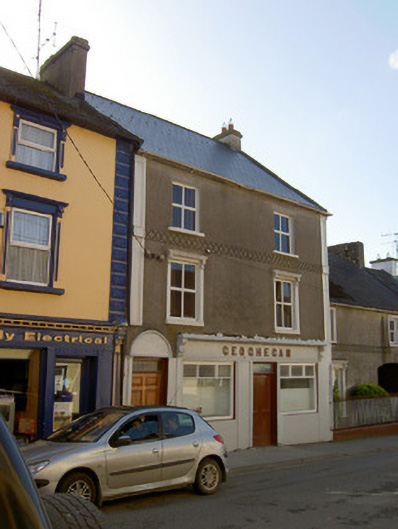 Terraced two-bay three-storey house, built c.1880, with former shopfront to ground floor. Pitched artificial slate roof with rendered chimneystacks and cast-iron rainwater goods. Smooth rendered walls with render double-height panelled pilasters to upper floors, with band of incised lozenges between upper floors and continuing around south gable. Square-headed replacement uPVC windows, with render surrounds to first floor having console brackets supporting cornices. Replacement timber door to north providing access to upper floors, with render surround. Rendered shopfront comprising simple pilasters flanking double leaf timber panelled shop door and replacement timber display windows, with fascia, consoles, dentils, raised lettering and having remains of decorative timber cornice above.