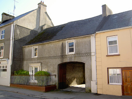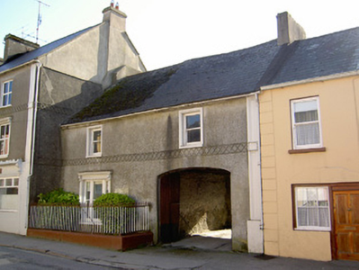 Terraced two-bay two-storey house, built c.1880, with segmental-headed integral carriage arch to south. Pitched artificial slate roof with terracotta ridge tiles and rendered chimneystacks. Smooth rendered walls with band of incised lozenges between floors and having full-height pilaster to south end. One-over-one pane timber sliding sash windows with render surrounds, tripartite and having console brackets and cornice to ground. Timber battened double-leaf door to carriage arch with decorative rendered keystone. Decorative cast-iron railings with rendered plinth to front of site. Single and two-storey outbuildings to rear with pitched slate roofs and roughcast rendered walls.