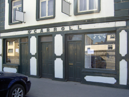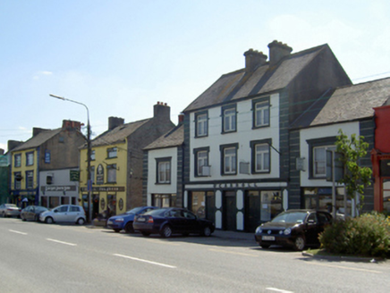 Attached three-bay three-storey house, c.1915, on a rectangular plan with shopfront to ground floor; single-bay two-storey flush end bays. Now disused. Pitched slate roof, clay ridge tiles, paired rendered central chimney stacks having corbelled stepped capping supporting yellow terracotta pots, concrete coping to gables, and cast-iron rainwater goods on rendered eaves retaining cast-iron downpipes. Rendered shuttered mass concrete walls with rusticated rendered piers to ends. Rendered shopfront to ground floor on a symmetrical plan centred on timber panelled door having overlight. Square-headed window openings (first floor) with concrete sills, and rendered lugged surrounds framing timber casement windows. Square-headed window openings (top floor) with concrete sills, and rendered low-relief surrounds with hood mouldings framing timber casement windows. Square-headed window openings in bipartite arrangement (end bays) with concrete sills, timber mullions, and rendered low-relief surrounds with hood mouldings framing one-over-one timber sash windows having part exposed sash boxes. Street fronted with concrete footpath to front.