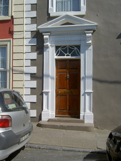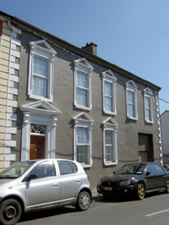 End-of-terrace five-bay two-storey house, built c.1820, with integral carriageway to south end of front elevation. Pitched slate roof with rendered chimneystack and render eaves course. Painted rendered walls with render plinth and quoins. Roughcast rendered walls to southwest gable. Square-headed openings with painted stone sills, replacement uPVC windows and render surrounds comprising panelled pilasters, moulded consoles, decorative friezes, dentillated cornices and pediments. Square-headed door opening to north end of façade with replacement timber door, cobweb over-light, concrete step, and render surround comprising fluted pilasters and consoles, decorative frieze, dentillated cornice and pediment. Square-headed integral carriageway, now partially blocked, with metal panelled door.