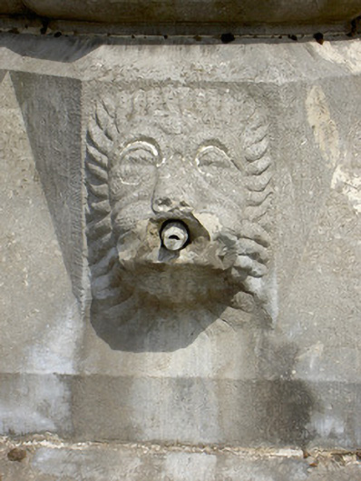 Freestanding fountain, dated 1904. Carved limestone octagonal-plan base with carved limestone centre-piece comprising four engaged colonettes with shared decorative cornice and elaborate pyramidal upper part with pedimented sides and topped with wrought-iron gas lamp standard having spherical lamp. Carved lion mask spouts to each side of base of centre-piece and harp motifs in relief to pediments.