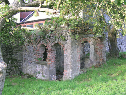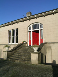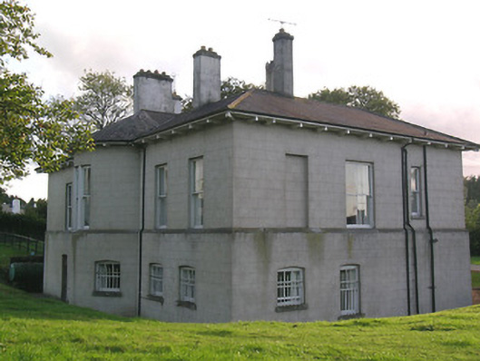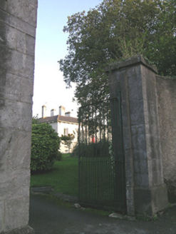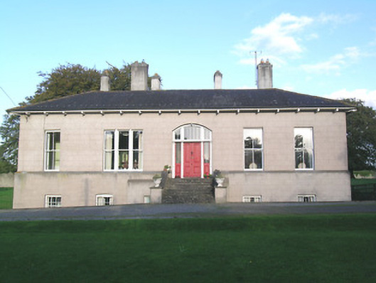 Detached five-bay single-storey house over half-basement, built c.1820, facing west and having three-bay end elevations and four-bay rear elevation with full-height bowed bay to centre. Hipped slate roof with eaves brackets and cast-iron rainwater goods and tall, rendered chimneystacks. Ruled-and-lined rendered walls, slightly projecting to lower half and having limestone coping. Square-headed windows to piano nobile without sills, and segmental-headed windows to basement with limestone sills. Timber sliding sash windows, triple one-over-one pane to one window of piano nobile of each elevation, two-over-two pane elsewhere to piano nobile, and barred three-over-three pane windows to basement. Segmental-headed entrance doorway having double-leaf timber panelled door flanked by sidelights with glazing over timber panels and having paned over-light. Flight of limestone steps over basement area, with rendered walls having limestone copings. Roofless two-bay single-storey garden building to north boundary with rubble limestone walls and round-arch door and window openings with brick voussoirs and jambs. Gate lodge to northwest, inside entrance gateway, having ruinous hipped slate roof, brick chimneystack and square-headed window and door openings. Quadrant entrance gateway having rendered walls, tooled limestone piers with caps, rebates and plinths, and double-leaf cast-iron gates.