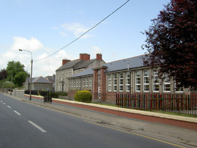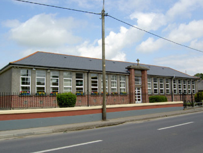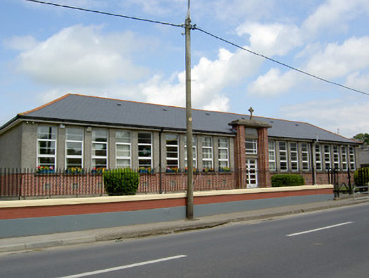 Detached multiple-bay single-storey school, dated 1937, with slightly higher articulated entrance bay and having two-bay double-height hipped-roofed return and single-storey flat-roofed extensions to rear. Hipped artificial slate roof with brick chimneystacks and terracotta ridge capping. Dressed limestone cornice with carved limestone cross finial to entrance bay. Roughcast rendered walls with English bond red brick walls, having render plinth and square-headed panels with chamfered render surrounds and cast-iron grilles below windows to front elevation. Entrance bay has projecting stepped-profile red brick jambs and having carved limestone date plaque. Square-headed window openings with limestone sills and replacement uPVC windows. Square-headed door opening with half-glazed timber panelled double-leaf door with window over and limestone step. Brick and rendered boundary wall with cast-iron railings to front of site having cast-iron piers and gate.