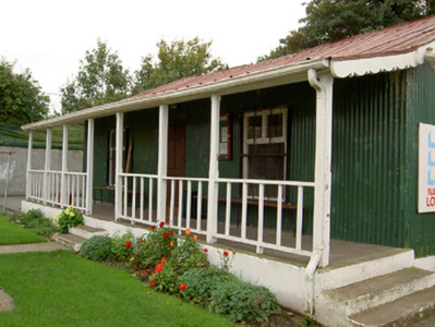 Detached three-bay single-storey tennis pavilion, built c.1880, with verandah to front elevation, and two lean-to projections to rear. Pitched corrugated-iron roof with scalloped and pierced timber bargeboards to gables. Painted corrugated-iron cladding to walls on concrete plinth. Verandah with moulded timber cornice, chamfered timber posts and timber railings, with concrete pavement and accessed via concrete steps. Square-headed openings with timber casement windows and timber panelled door. Roughcast rendered boundary wall with rendered capped piers, having recent decorative metal double-leaf gates.