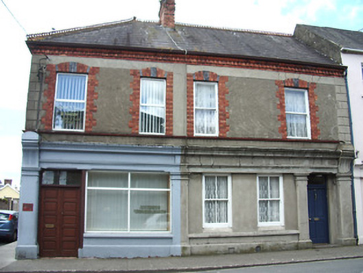 Corner-sited two-bay two-storey house, forming pair with house to north, built c.1880, having three-bay side elevation and with shopfront to front ground floor. Pitched slate roof with terrcotta cresting and finials to ridge, red brick chimneystack, red brick eaves course, and cast-iron rainwater goods. Roughcast rendered walls with render quoins, smooth render band above first floor windows and below same in front elevation, with render plinth course. Square-headed window openings with red brick block-and-start jambs and red and blue brick heads and continuous moulded brick sill course to first floor. Replacement uPVC windows. Shopfront to front elevation with render moulded entablature, having chamfered pilasters with fluted concave consoles flanking openings to ground floor and having replacement uPVC display window and timber panelled double-leaf door with plain overlight, both openings having chamfered heads. Replacement uPVC door to side elevation.