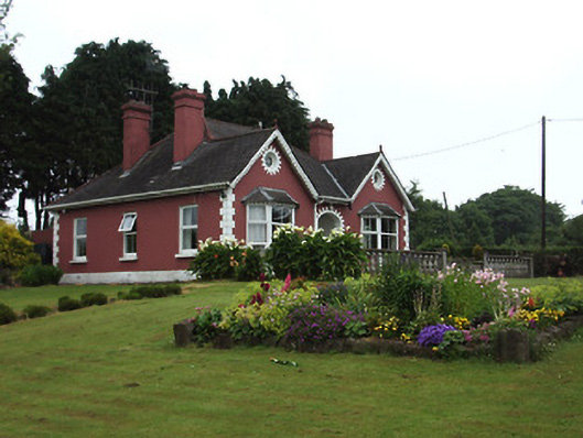 Detached square-plan three-bay single-storey house, built c.1910, with three-bay side elevations and having gables and bay-windows to end bays of front elevation. Hipped slate roof, pitched to front gables, with rendered chimneystacks, cast-iron rainwater goods, finials to hips, and finials and carved timber bargeboards to front gables. Painted rendered walls and plinth, with render quoins and render quoin detail under bay-windows. Square-headed window openings with replacement uPVC windows and painted rendered sills. Oculi to upper gables with metal frame pivoting windows and block-and-start surrounds. Elliptical-headed opening to recessed porch, with render block-and-start surround, tiled pavement and having glazed timber panelled door with side-lights and overlights. Rendered boundary wall with capped piers and wrought-iron double-leaf gate.