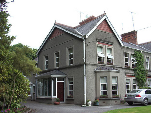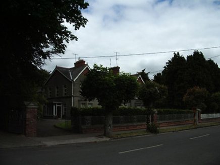 Semi-detached two-bay two-storey house, built c.1920, with three-bay west elevation, having gables to west elevation and to west end front bay, latter having canted-bay window, recent porch to west elevation and recent conservatory and two-storey extension to rear. Pitched slate roof with terrcaotta ridge tiles, cresting and finials, red brick chimneystack and uPVC rainwater goods. Pierced timber bargeboards to gables, with terracotta tile decoration, smooth render platbands. Roughcast rendered walls with render string course doubling as continuous first floor sill course. Square-headed window openings, paired to front elevation, with moulded render surrounds, canopies and terracotta tiled friezes to two front windows. Replacement uPVC windows throughout. Modern uPVC glazed porch to entrance at west elevation, with replacement timber panelled door and overlight. Low red brick plinth wall to front boundary, with brick piers having pediment detail to capping, decorative wrought-iron railings and double-leaf gate. Situated in landscaped grounds.