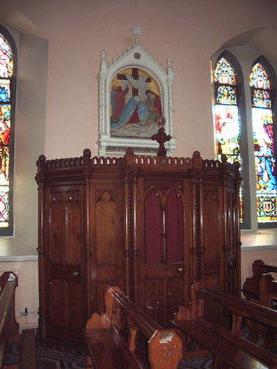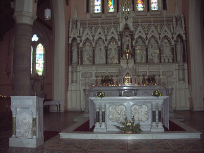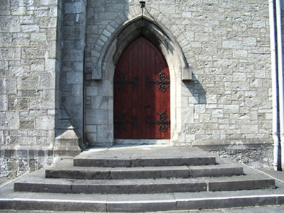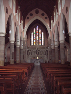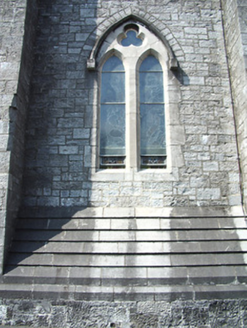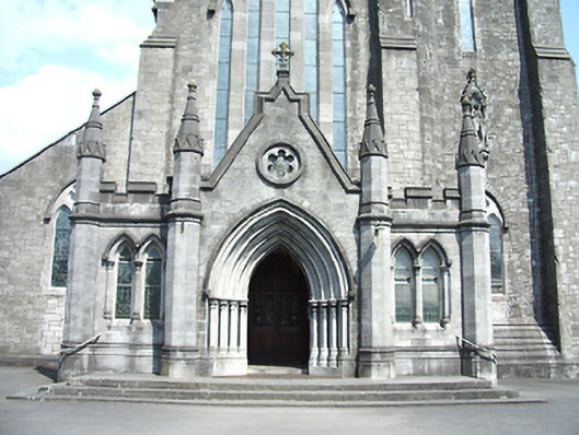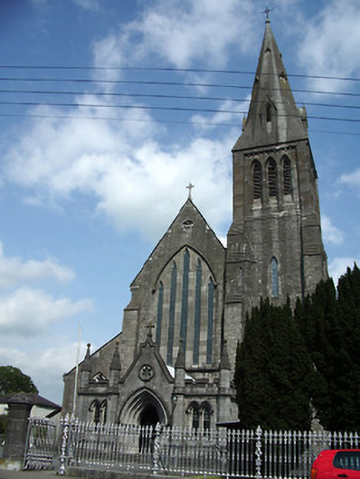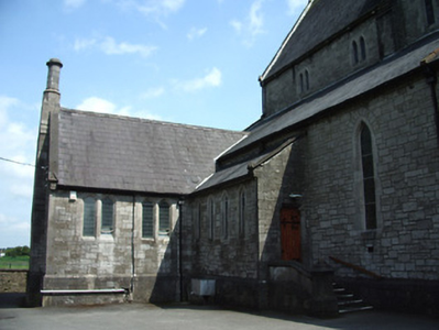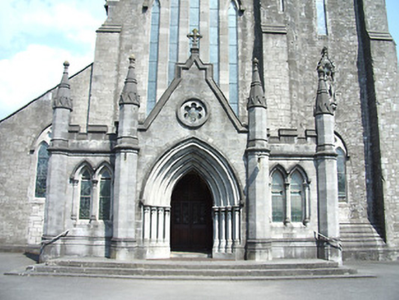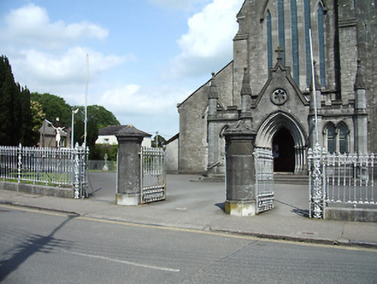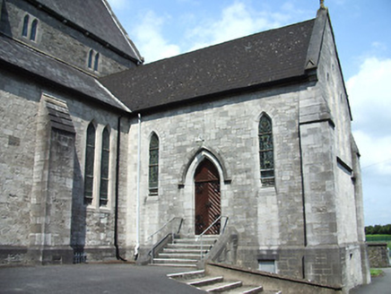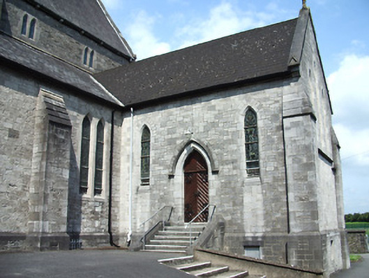 Freestanding cruciform-plan gable-fronted Catholic Church, built 1859. Comprises five-bay nave with side aisles, three-bay transepts, two-bay chancel, three-bay projecting porch, and mortuary chapel added c.1915, three-stage bell tower with spire, and having lean-to porch to north elevation and sacristy to northeast. Pitched slate roofs with carved limestone and metal cross finials, cut limestone copings, dressed limestone brackets to clerestory, with cast-iron rainwater goods. Slightly-projecting carved limestone octagonal chimneystack to sacristy. Broached octagonal spire to tower with metal cross finial and having trefoil and pointed vent-lights, latter with louvres. Carved limestone crenellations and spires to octagonal engaged columns to porch. Snecked dressed limestone walls with cut limestone dressings, buttresses to corners of plan, to lower two stages of tower and between windows of side aisles, plinth course and having moulded string courses to porch. Carved limestone statue of Saint Michael the Archangel in gabled niche to front of bell tower. Pointed-arch window openings throughout, five-light to west front, trefoil-headed five-light to east window, three-light to gables of transepts, two-light to side aisles and front of tower, and single elsewhere, having hood-mouldings to front elevation openings. Paired pointed arch windows to porch with hood-mouldings and engaged colonnettes, with hexafoil opening over central entrance doorway with moulded limestone surround. Grouped square-headed windows and paired pointed segmental-headed windows to sacristy. All windows have tooled limestone block-and-start surrounds. Paired lancets with trefoils under dressed stone hood-moulding to first stage of bell tower. Lancets to second stage, groups of three louvered trefoil-headed windows in pointed-arch surrounds to third stage of bell tower. Pointed order arch entrance to porch with cut limestone hood-moulding with four orders, comprising engaged columns and roll mouldings, with flight of stone steps. Secondary entrances with pointed arch opening to south elevation and to south transept, with flights of limestone steps. Shouldered entrance opening to north transept and north addition. All having battened timber double-leaf doors with ornate iron strap hinges. Textured and coloured glass to pitch pine porch screen with trefoil-headed details. Dressed limestone pointed arch opening to nave with six orders, comprising engaged columns and roll mouldings. Pointed-arch arcade separating nave and side aisles, with sandstone columns. Ornate carved marble reredos to main and side altars with figure sculpture. Ornate carved marble pointed segmental arcade to organ gallery with trefoil arcading detail to parapet, on polished granite columns. Boarded timber ceiling to braced truss roof supported on cut stone corbels to nave walls. Stained-glass windows, pitch pine confessionals and pews, timber and stucco Stations of the Cross. Octagonal dressed limestone piers with plinths and pyramidal caps to site entrance having decorative cast-iron piers to pedestrian entrances and decorative cast-iron railings and gates. Graveyard to north and south of site.