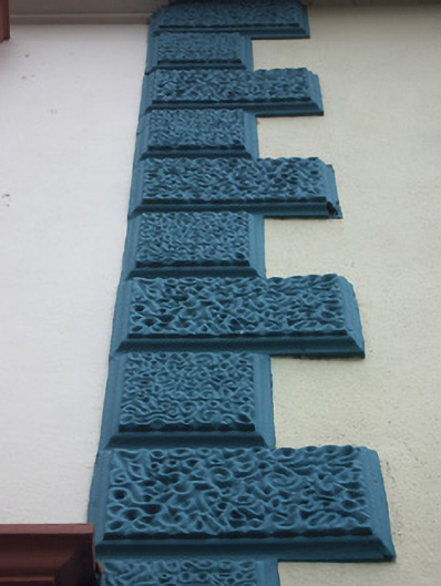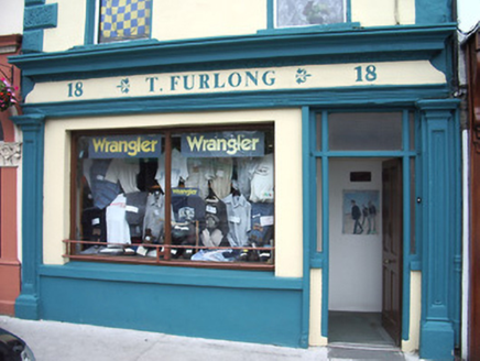 Terraced two-bay three-storey house, built c.1850, with shopfront to ground floor. Pitched slate roof with brick and rendered chimneystack, with boxed eaves and cast-iron rainwater goods. Painted rendered walls with vermiculated render quoins. Square-headed window openings with painted stone sills and replacement uPVC windows. Timber and render shopfront with moulded cornice and string course, panelled pilasters with moulded capitals and fascia with painted lettering. Altered square-headed display window to ground floor with painted rendered sill and wrought-iron window guard. Replacement timber panelled entrance door with margined glazing to timber surround and plain overlight.