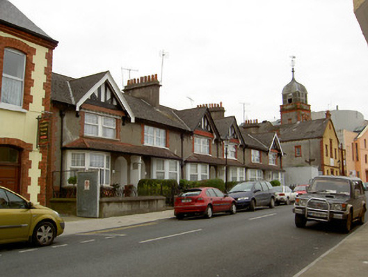 Terraced two-storey house, one of similar terrace of six, built c.1905, with two-bay ground floor and one-bay first floor, bowed bay-window to front, canopy to front over bay window and porch shared with neighbouring house. Pitched artificial slate roof with rendered chimneystack and cast-iron rainwater goods, and red tile roof to front canopy. Pebble-dashed walls with red brick quoins and render diamond panel to first floor and red brick plinth wall to bay window. Square-headed window openings, paired with red brick block-and-start surround to first floor, with concrete sills and replacement uPVC windows. Round-headed recessed entrance porch, with pierced timber screen shared with neighbouring house, and tiled step. Square-headed door opening with glazed vertical-paned timber panelled door and having horizontal-paned overlight. Low rendered boundary wall to front garden with ornate wrought-iron railings and gate.