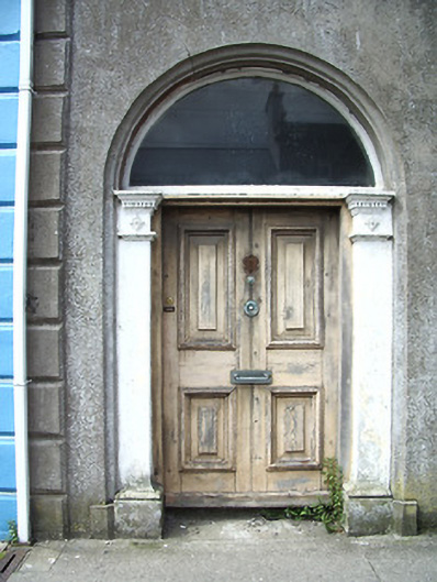 Terraced five-bay two-storey house, built c.1840, with integral carriage arch. Pitched slate roof with rendered chimneystack and cast-iron and uPVC rainwater goods. Rendered walls with render quoins. Square-headed window openings with recessed moulded surrounds, stone sills and timber sliding sash one-over-one pane windows, with timber panelled shutters visible to interior. Round-headed entrance opening with recessed moulded surround and plinth blocks. Timber and render pilasters to door with dentils and floral motif. Timber panelled door with plain fanlight. Flat-arch opening to carriage arch, with chamfered surround and double-leaf timber battened door.