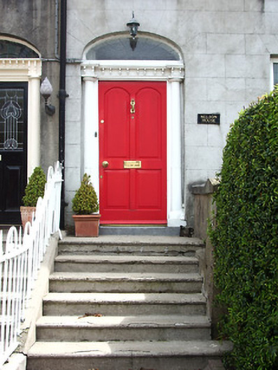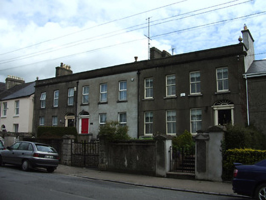 Terraced three-bay two-storey over basement house, one of a terrace of three, built c.1840. Pitched roof, covering not visible. Rendered chimneystack and parapet with coping, moulded string course, vase finial and cast-iron rainwater goods. Ruled-and-lined rendered walls. Square-headed window openings with rendered sills and replacement uPVC windows. Elliptical-headed entrance opening with timber panelled door flanked by fluted rendered engaged columns, having moulded cornice and decorative brackets to fanlight with lead spokes, accessed by concrete steps with wrought-iron railings. Roughcast rendered boundary wall to front garden with capped piers and wrought-iron pedestrian gate.