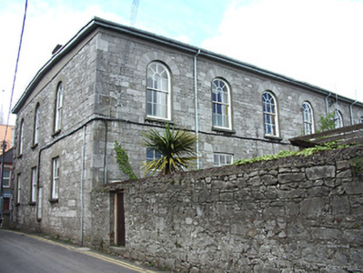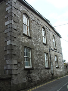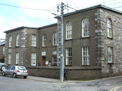 Detached U-plan two-storey former school, dated 1842, with projecting two-bay ends flanking three central bays and three-bay side elevations, now in use as community centre. Low pitched roof, covering not visible, with rendered chimneystacks, cast-iron rainwater goods and rendered eaves course. Rendered walls to front elevation, ruled-and-lined, with date plaque to central bay, snecked limestone walls elsewhere, with dressed limestone quoins and plinth course. Round-headed window openings to first floor with stone sills and timber sliding sash three-over-six pane windows. Square-headed window openings to ground floor with stone sills and timber sliding sash six-over-six pane windows, six-over-three panes to central bay. Square-headed entrance openings to centre end bays, with replacement timber panelled double-leaf doors, and plain overlights. Block-and-start surrounds to openings on south elevation and dressed limestone voussoirs to rear openings. Coursed rock-faced capped low boundary wall to front elevation, high random rubble stone boundary wall to rear.