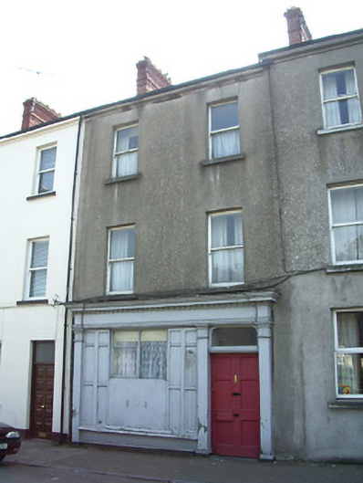 Terraced two-bay three-storey house, built c.1880, ground floor formerly in use as shop, shopfront intact. Pitched slate roof with red brick chimneystack and cast-iron rainwater goods. Rendered walls with rendered eaves course. Square-headed window openings with stone sills and timber sliding sash one-over-one pane windows. Timber shopfront to ground floor having moulded dentillated cornice, fascia board, and pilasters with moulded bases. Square-headed entrance opening with timber panelled door and shouldered overlight. Square-headed quadripartite display window with painted timber sill, timber panelled fixed shutters and low painted rendered stall riser.