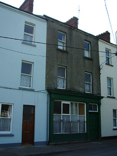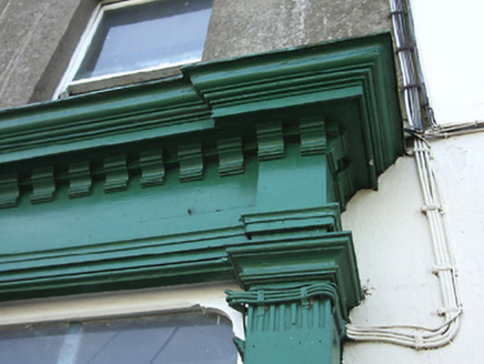 Terraced two-bay three-storey house, built c.1880, ground floor formerly in use as shop, shopfront intact. Pitched slate roof with red brick chimneystack and cast-iron rainwater goods. Rendered walls with rendered eaves course. Square-headed window openings with stone sills and timber sliding sash one-over-one pane windows. Timber shopfront to ground floor having moulded dentillated cornice, fasciaboard, and pilasters with moulded bases. Square-headed entrance opening with timber panelled door and shouldered overlight. Square-headed quadripartite display window with recent wrought-iron sill guard and coursed dressed stone plinth to timber stall riser.