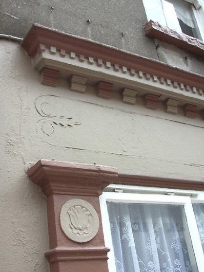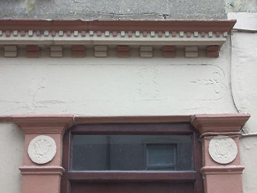 Terraced two-bay three-storey house, built c.1860, with shopfont. Pitched slate roof with coursed limestone and rendered chimneystack with moulded coping, and cast-iron rainwater goods. Rendered walls with moulded rendered plinth. Camber-arch window openings to upper floors, with painted stone sills and timber sliding sash two-over-two pane windows. Timber and rendered shopfront to ground floor, having moulded dentillated cornice with modillions, plain fascia with incised decoration, and pilasters with decorative roundels. Square-headed former display window to ground floor with replacement timber glazing and painted rendered sill. Timber panelled entrance door with plain overlight and flanked by pilasters.