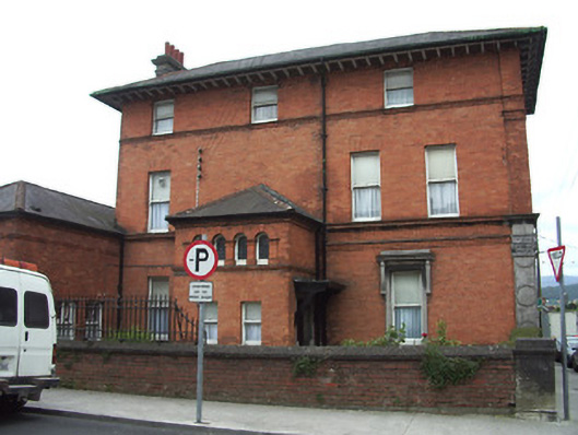 Corner-sited purpose-built former bank, built 1877-8, comprising three-storey L-plan main block, southern three bays set back from streetscape, with five-bay long and three-bay short, northern, elevations. Double-height porch to north elevation and four-bay single-storey wing advanced from longer elevation and having single-storey block to east elevation. Hipped slate roofs with red brick chimneystacks with carved limestone copings and decorative brick detailing, rafters exposed to overhanging eaves of main block, and cast-iron rainwater goods. Red brick parapet in running bond to wing, with moulded render coping, panelled piers and finials. Red brick walls, common bond to main block with fifth course headers and with running bond to east block. Moulded brick string courses throughout, those at sill levels in main block doubling as sill courses. Decorative façade to west elevation ground floor, consisting of moulded dressed limestone entablature with dentillated cornice, coursed frieze, panelled pilasters, narrower between windows, with Composite capitals, moulded sill course, coursed limestone plinth and moulded plinth course. Arcaded group of round-headed windows to upper elevation of north porch with raised brick surrounds comprising brick voussoirs, keystones and pilasters and having timber windows with leaded coloured glazing. Square-headed window openings elsewhere, with one-over-one pane timber sliding sash windows. Moulded limestone surrounds to ground floor windows of west elevation, with cut limestone canopies over fluted limestone brackets, latter over carved limestone string course. Timber sliding sash one-over-one pane windows throughout. Elaborate carved limestone doorcase to entrance at ground floor of west elevation, with elliptical-headed opening surmounted by pediment with clam shell feature to tympanum, fluted brackets, panel to frieze, moulding to arch, fluted pilasters to door jambs, and timber panelled door, accessed by limestone steps. Porch to north elevation having square-headed entrance opening, with timber canopy and carved timber brackets, moulded render surround, timber panelled door, and overlight. Red brick boundary wall in common bond with fifth course headers to north, with rendered coping. Red brick and coursed stone capped piers, wrought-iron railings and pedestrian gate.