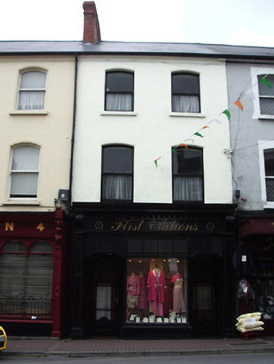 Terraced two-bay three-storey house, built c. 1880, with shopfront and separate access to upper floors. Pitched artificial slate roof with moulded eaves course, red brick chimneystack and cast-iron rainwater goods. Painted rendered walls. Segmental-headed window openings to upper floors with stone sills and timber sliding sash one-over-one pane windows. Timber shopfront with panelled pilasters, moulded cornice, decorative brackets, fasciaboard and glazed screen to top with coloured and textured glass. Centrally-placed square-headed timber display window with moulded sill to rendered stall riser. Recessed entrance openings to each end with tiled pavements and timber panelling to sides of porches. Square-headed door openings with decoratively-glazed timber doors and overlights having coloured and textured glass.