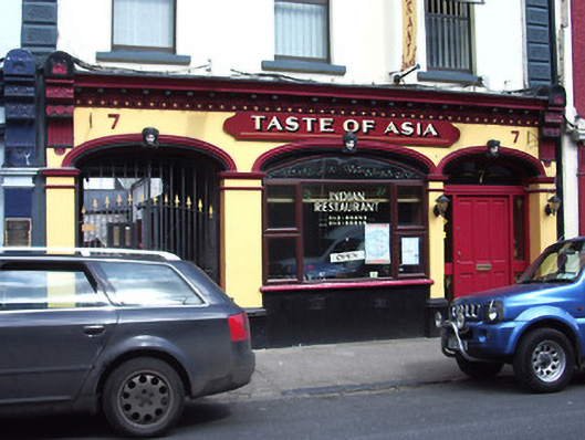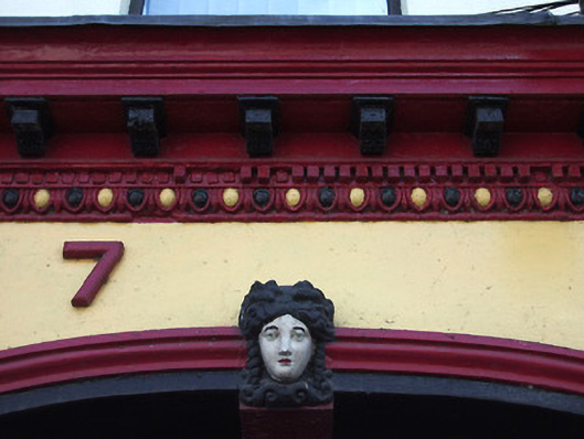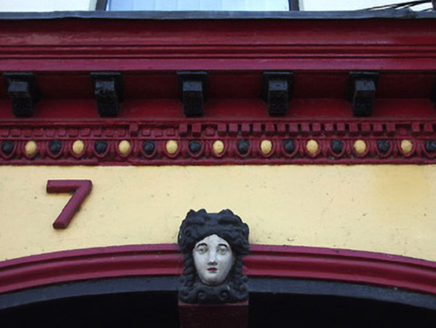 Terraced three-bay three-storey house, built c. 1860, with arcaded shopfront and integral carriage arch. Roof not visible, red brick chimneystack, cast-iron rainwater goods and bracketed eaves course. Painted rendered walls with decorative render quoins. Square-headed openings to upper floors with moulded brackets to canopies, continuous moulded sill course to second floor, stone sills to first floor. Replacement timber windows. Timber and render shopfront with moulded cornice, brackets, dentils, egg-and-dart course, moulded fluted consoles. Elliptical arched end openings and depressed arch window opening to ground floor with moulded archivolts having masks to keystones. Replacement timber door and sidelights with plain fanlight. Replacement uPVC display window. Wrought-iron double-leaf gates to carriage arch.