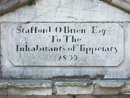 This is an important and useful landmark for the town of Tipperary, as it was a source of drinking water until the late nineteenth century, when a piped supply from Lough Muskry was established. It is also a record of a charitable donation by Stafford O'Brien Esq (1783-1864), a prominent local landowner.