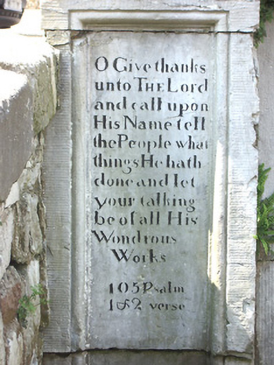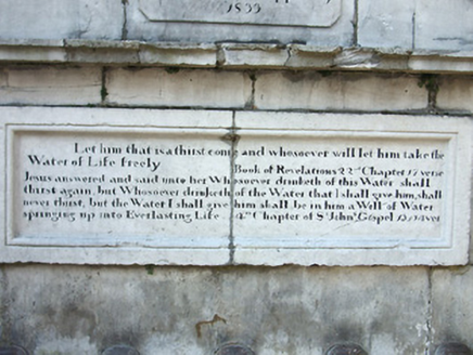 Freestanding well, dated 1833, with boundary wall and steps to main elevation. Coursed limestone wall to main elevation with pediment, moulded cornice, dentils, and panelled pilasters. Series of animal heads spouting water into stone trough. Carved limestone commemorative panel to pediment. Further plaque to pediment and inscriptions to tops of pilasters, all with biblical texts. Dressed coursed stone facing to rear elevation, with metal cramps joining both faces together. Random rubble stone side boundary walls with dressed limestone copings and piers.